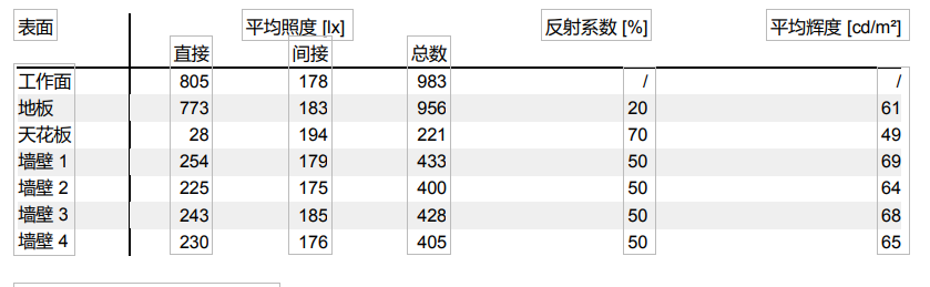 Average illuminance [lx] Minimum illuminance [lx] Minimum illumination/average illumination Minimum/Maximum Illumination
